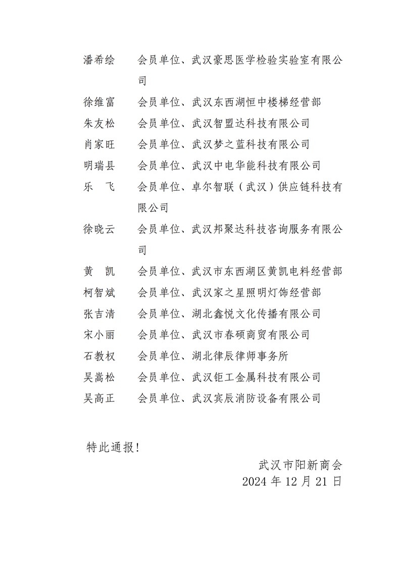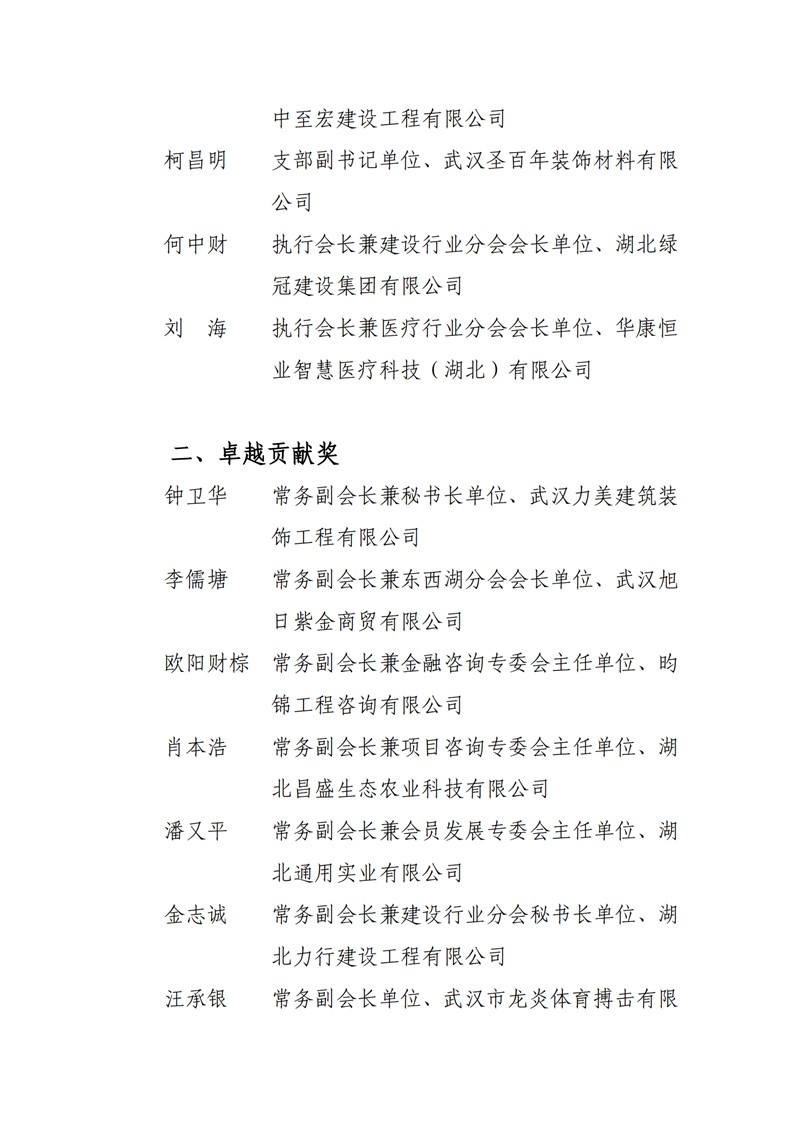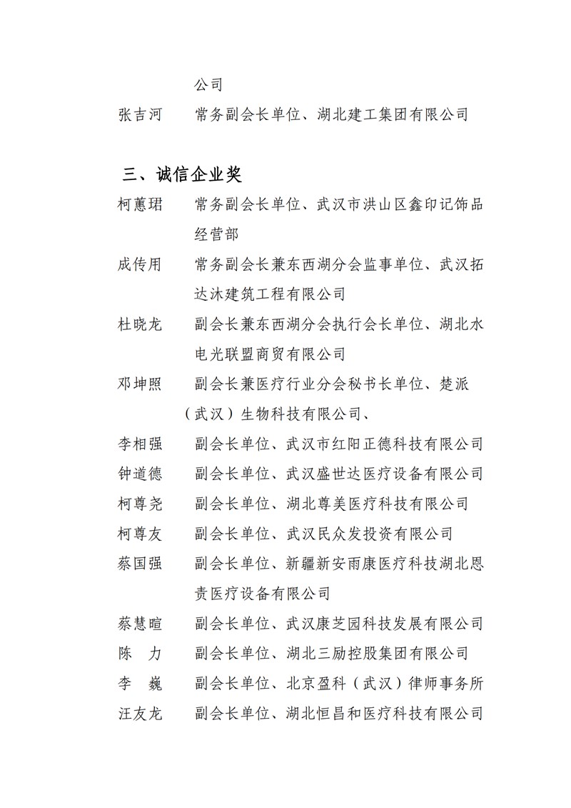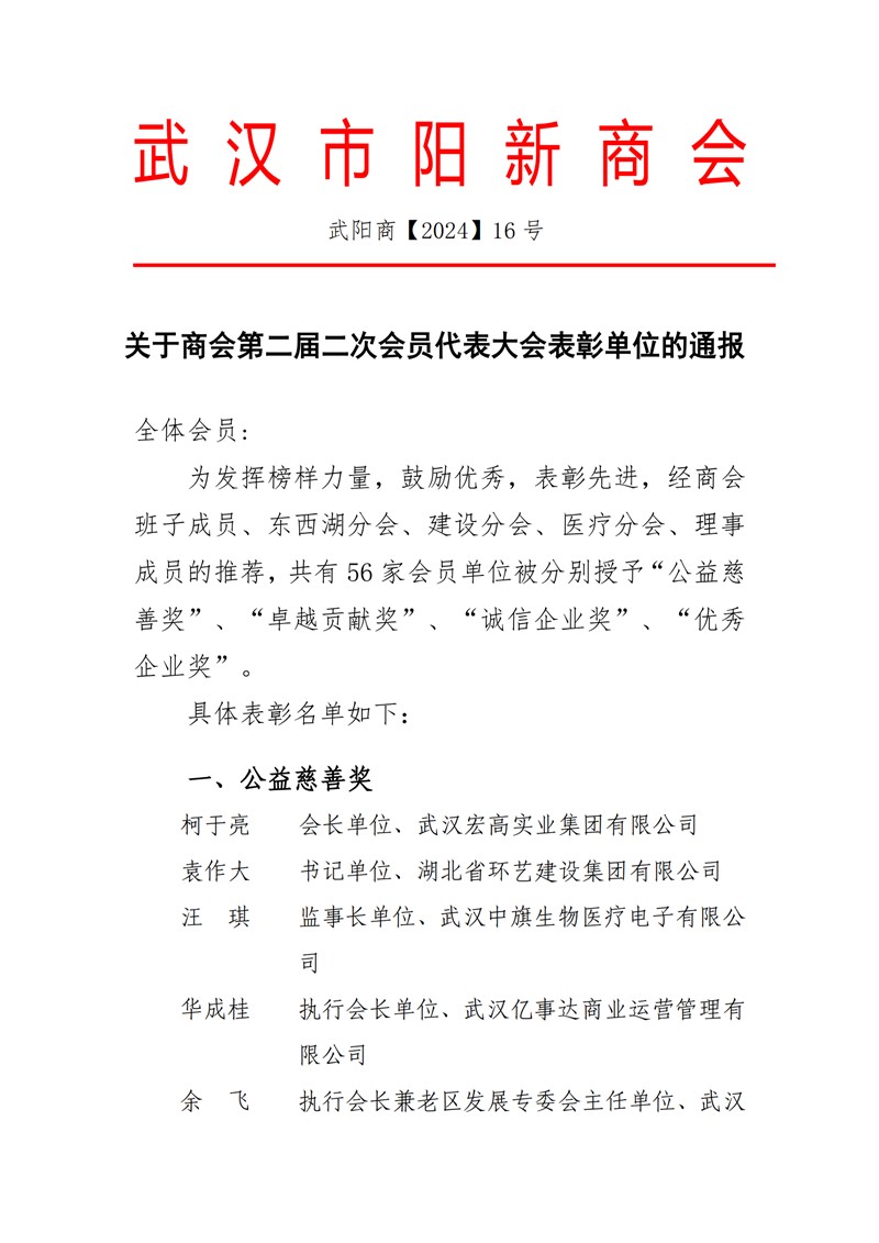 关于商会第二届二次会员代表大会表彰单位的通报 2024-12-24 15:38 查看: 为发挥榜样力量,鼓励优秀,表彰先进,经商会班子成员、东西湖分会、建设分会、医疗分会、理事成员的推荐,共有56家会员单位被分别授予“公益慈善奖”、“卓越贡献奖”、“诚信企业奖”、“优秀企业奖”。 具体表彰名单如下: