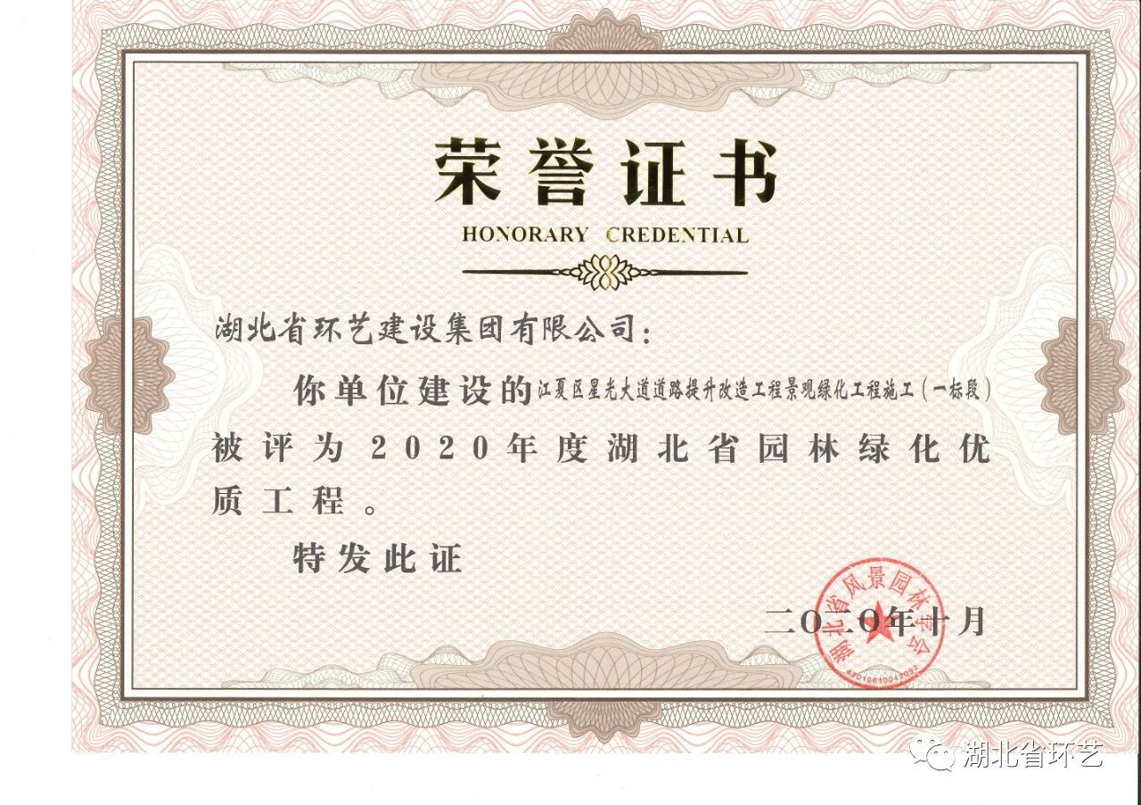 近日,湖北省环艺建设集团承建的江夏区星光大道道路提升改造工程景观绿化工程施工项目荣获由湖北省风景园林学会主办,经湖北省风景园林学会园林绿化企业专业委员会评选的“2020年度湖北省城市园林绿化优质工程项目奖”。
